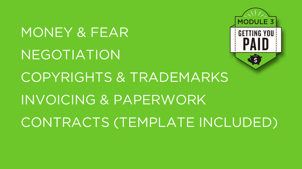 You will make progress on your business through the assignments in this course. Each one builds on the skills learned in the previous sessions. At the end of the cycle, you’ll have set up your own systems to Get Found, Get Hired, and Get Paid…and get back to making more great art.